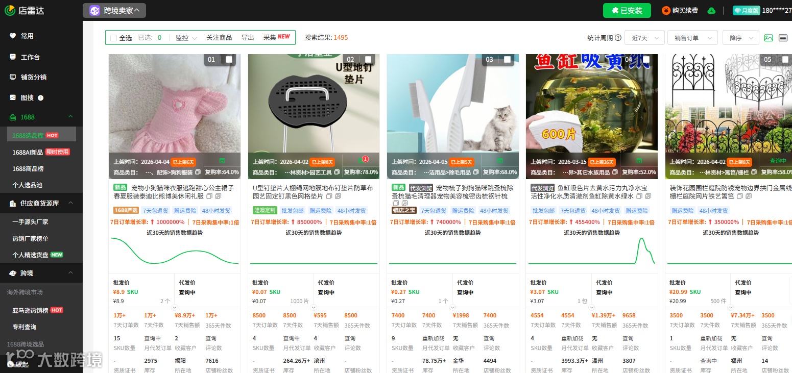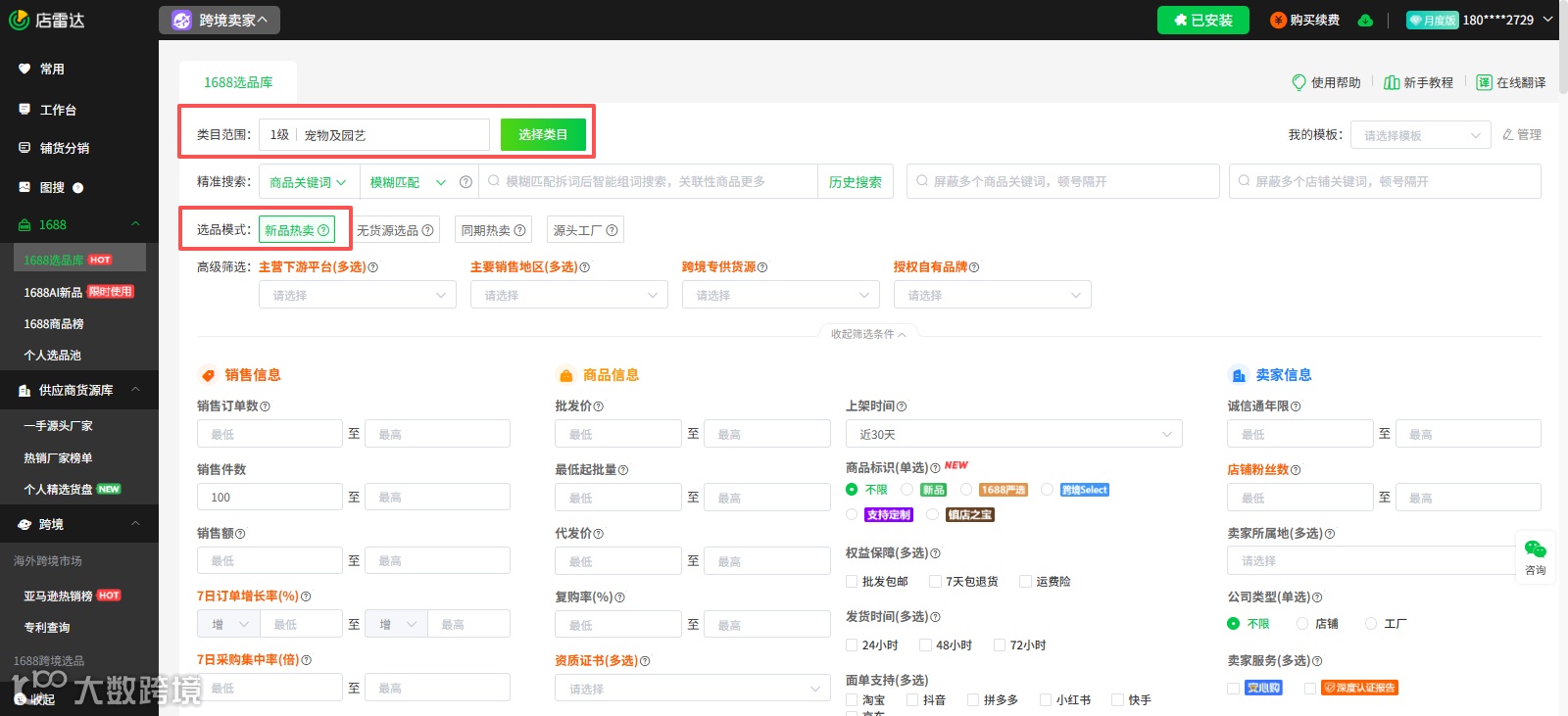 首先我们可以先从1688上找款(1688是目前最大的线上货源平台,品类齐全、市场反应快),通过店雷达选品工具,进入1688选品库,选择目标类目(例如宠物园艺),勾选新品热卖(上架时间近30天、销售订单大于100的品),这样可以快速挖掘近期上架且销量不错的新品,这类产品已通过市场验证,需求真实,且竞争尚未白热化,能有效规避滞销风险。
