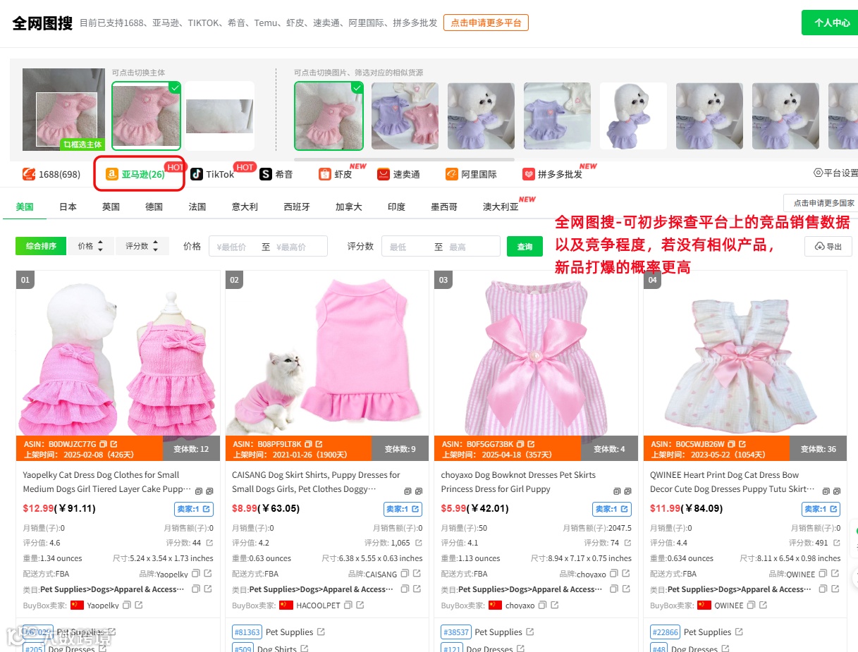 接着,在筛选商品时重点关注一个核心指标:销量较高,优先选月销稳定、月销呈上升趋势的产品,再通过全网图搜-可初步探查平台上的竞品销售数据,以及竞争程度,若没有相似产品,新品打爆的概率更高。