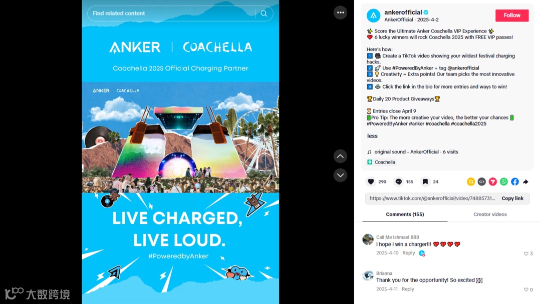 另一边,Anker在TikTok上也做内容预热,直接放出福利:送6张科切拉VIP门票。并且还设置了一个简单的UGC玩法,让大家分享自己的“音乐节充电小技巧”,带上挑战赛标签#PoweredByAnker并@官方账号就能参与抽门票。