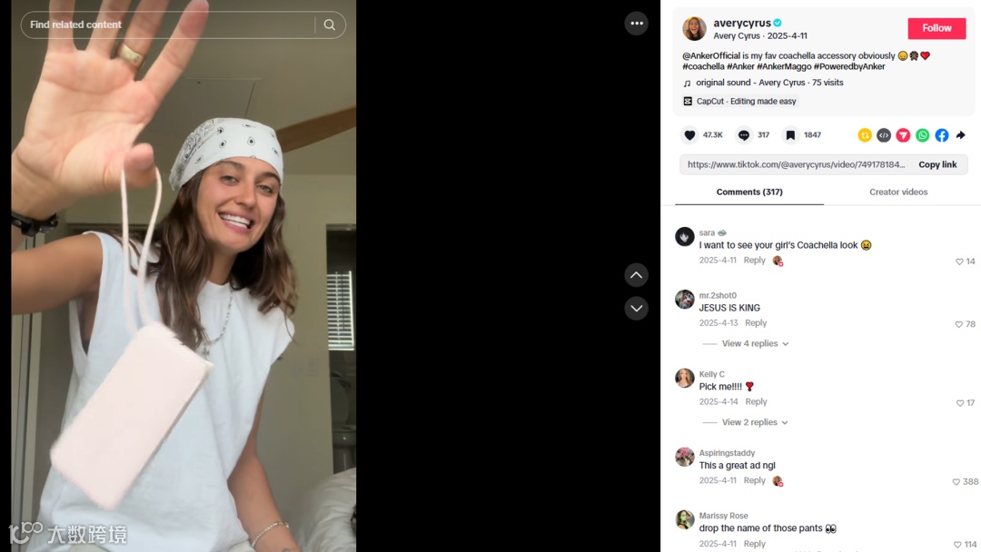 视频中,@Avery Cyrus先是展示音乐节白天炎热、夜晚寒冷、沙漠环境易泥泞等真实场景痛点,建立代入感和实用需求,再延伸到手机高频使用导致电量焦虑的问题,自然引出Anker充电宝作为“音乐节必备配件”。