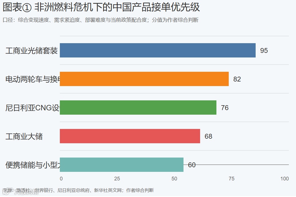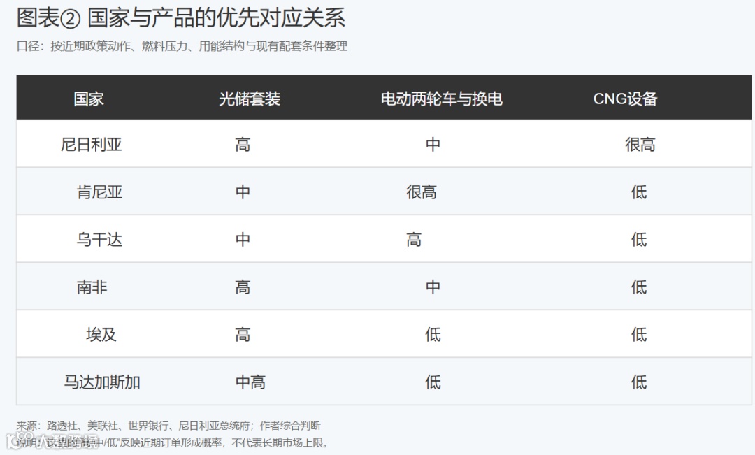 对在非中企和出口商而言,关键问题聚焦于订单落地时间及优先区域。乘用电动车整车需求将增长,但短期内订单最快落地的为中国三类替代设备:工商业光储套装、东非电动两轮车与换电设备、尼日利亚CNG改装及加气站设备。
