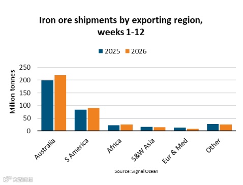 BIMCO数据显示,全球铁矿石海运量增长源于中国进口需求增强,但终端消费疲软。今年前两月中国钢铁产量同比下降4%,主要受房地产新开工面积下滑拖累。当前全球74%的海运铁矿石流向中国,其需求变化仍主导全球贸易格局。