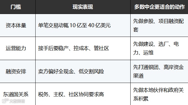 近一年非洲金矿并购热潮中,中企身影逐渐显现,但头部金矿控制权仍长期由巴里克矿业、纽蒙特等国际巨头主导。紫金矿业已实现突破,山东黄金稳步推进,多数中企仍需跨越资本体量、运营能力、融资安排与东道国关系四道核心门槛。