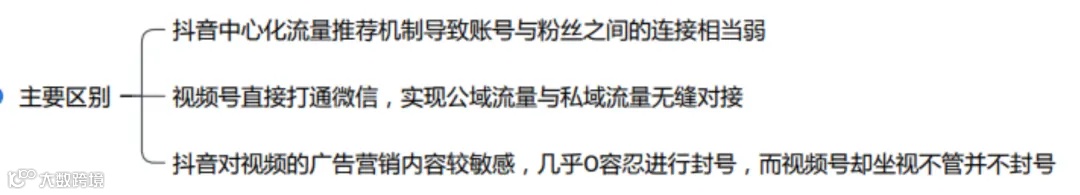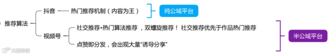 2、推荐算法:抖音采用内容驱动的热门推荐机制(纯公域),视频号基于社交关系的半公域平台
