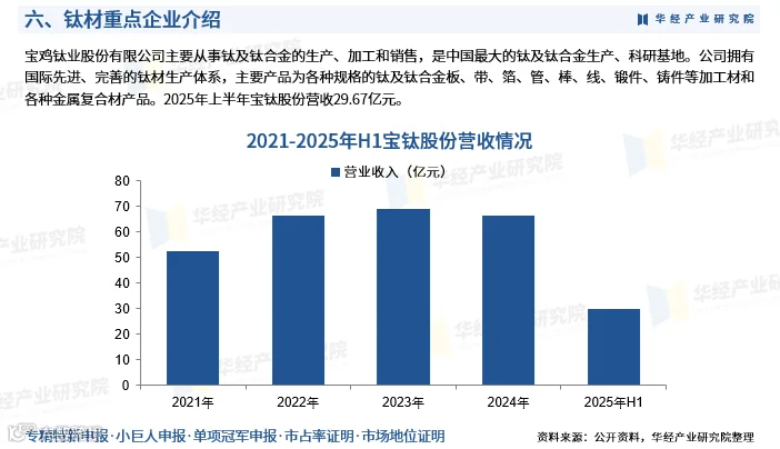 宝鸡钛业股份有限公司(简称“宝钛股份”)是我国最大的钛及钛合金科研生产基地,拥有国际先进、覆盖完整的钛材生产体系,产品涵盖钛及钛合金板、带、箔、管、棒、线、锻件、铸件及金属复合材料等。2025年上半年实现营收29.67亿元。