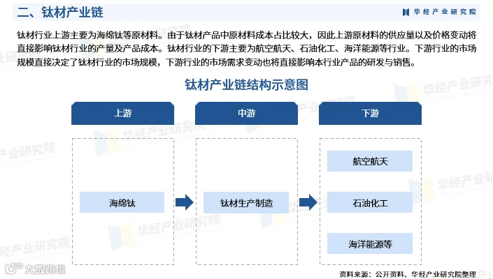 钛材工业主要包括四大环节:一是以金红石和钛铁矿为原料,经选矿富集后通过镁还原法等工艺制取海绵钛;二是以海绵钛为原料熔铸成钛锭或钛合金铸锭;三是通过锻造、轧制、挤压、拉拔及热处理等加工方式,生产各类规格的钛及钛合金板、管、棒、线、锻件、铸件等;四是在航空航天、能源、化工、医疗等领域进行深加工,制造钛及钛合金零部件或成套装备。