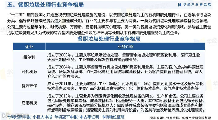 “十二五”以来,餐厨垃圾处理设施建设逐步提速;伴随垃圾分类全面推行与低碳循环经济导向强化,以餐厨垃圾为核心的有机固废处理行业进入加速成长期。主要参与者分为两类:一类聚焦成套设备制造,代表企业包括维尔利、时代桃源、万德斯、嘉诺科技、艾尔旺等;另一类专注资源化利用服务,既有光大环境、瀚蓝环境等综合型固废龙头,也有朗坤环境等长期深耕有机固废领域的专业服务商。