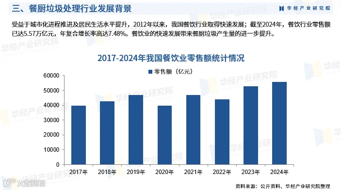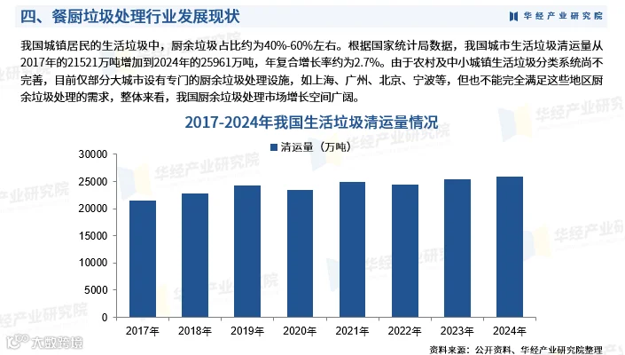 我国城镇生活垃圾中,厨余垃圾占比达40%–60%。据国家统计局数据,城市生活垃圾清运量由2014年的2.15亿吨增至2024年的2.60亿吨,年复合增长率约2.7%。目前,农村及中小城镇分类体系尚不健全,仅上海、广州、北京、宁波等大城市建有专业化厨余垃圾处理设施,且处理能力仍难以满足实际需求,整体市场增长潜力巨大。