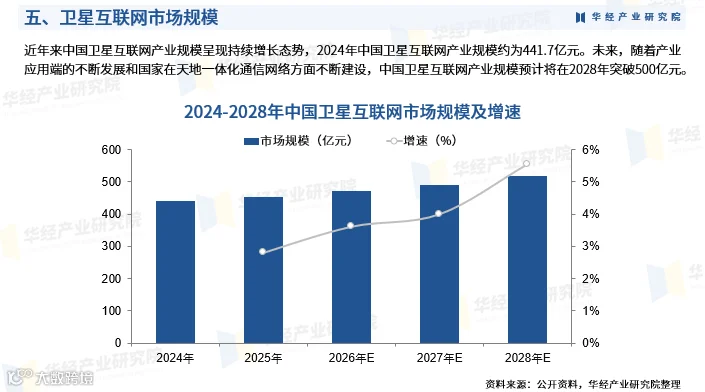 2024年中国卫星互联网产业规模达441.7亿元;随着天地一体化信息网络持续完善及下游应用拓展,预计2028年将突破500亿元。