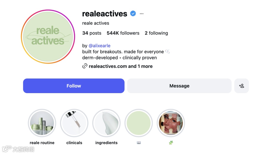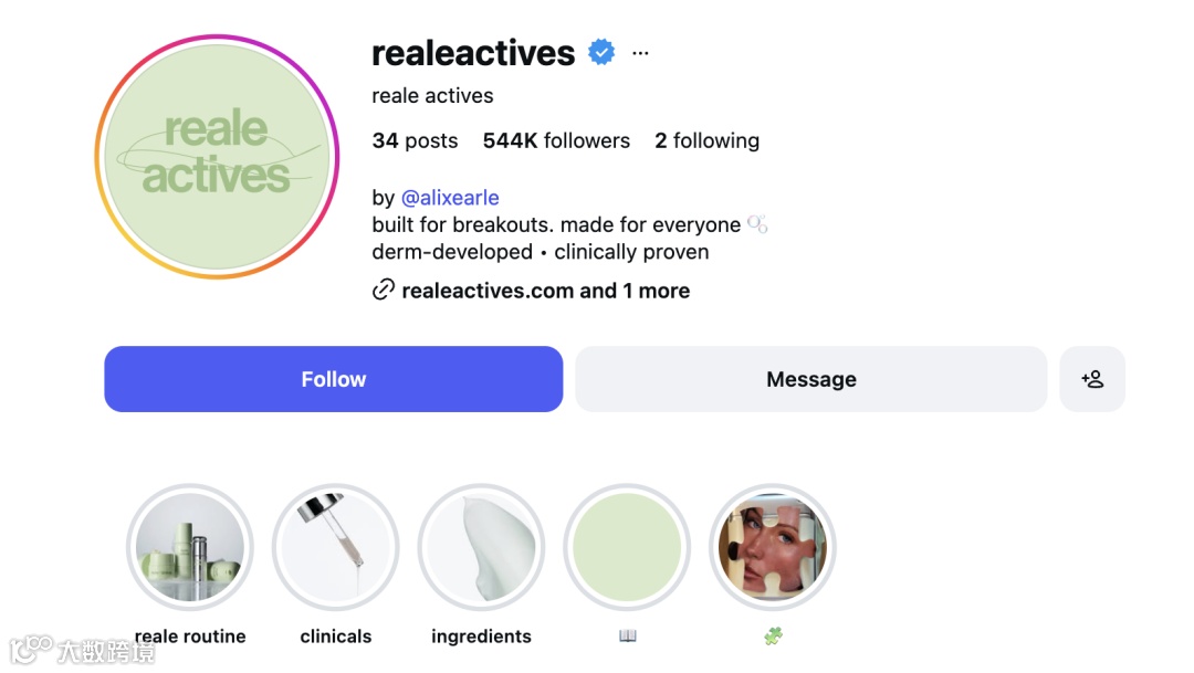 作为由顶流网红Alix亲自创立的护肤品牌,Reale Actives上线仅两周便在Instagram狂揽50万粉丝,是红人效应的极致体现。