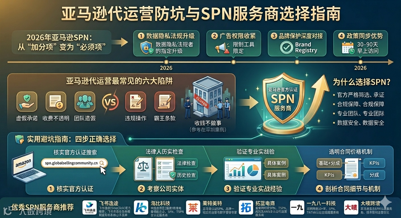 2026年的亚马逊代运营市场,正在从“野蛮生长”走向“合规淘汰”。对于卖家而言,选择服务商的逻辑也需要从“看谁承诺得好”转向“看谁资质过硬”。SPN认证不是万能的——它不能保证服务商一定让你爆单,但它能帮你筛掉那些连基本门槛都没过的玩家。在鱼龙混杂的市场中,先做减法,再做加法,是当下最理性的选择。