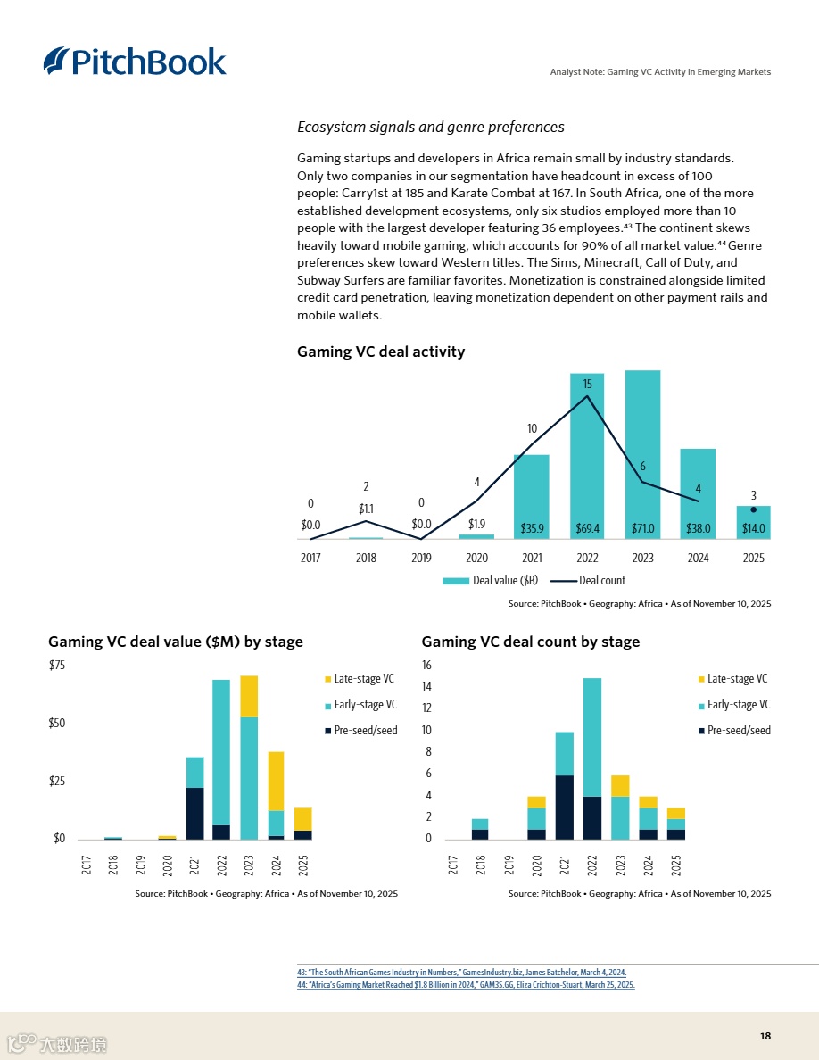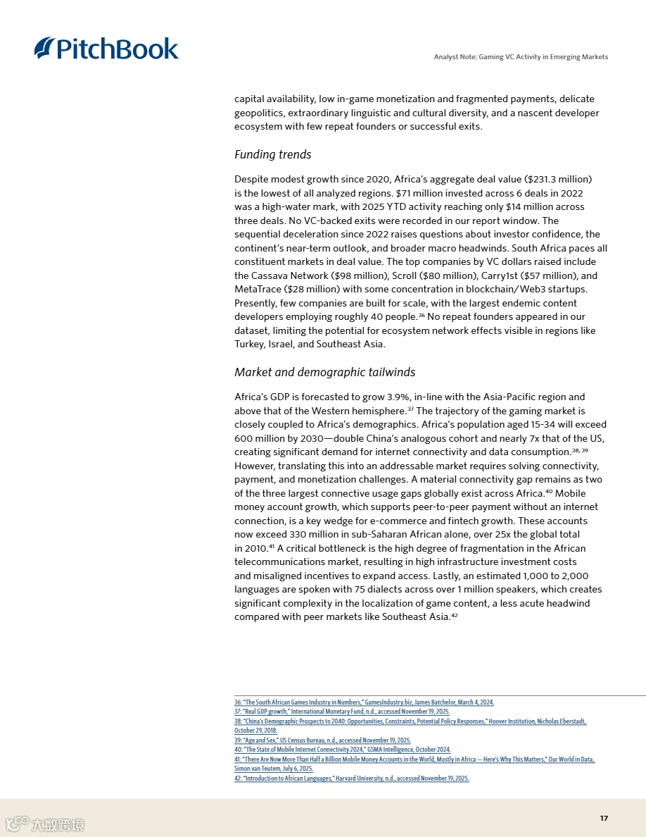 • 非洲市场依赖移动货币突破金融瓶颈,迈向内容自主生产:撒哈拉以南非洲已有3.3亿移动钱包账户,支撑14亿美元游戏市场;当前以消费进口内容为主,Cassava Network、Carry1st等初创正推进本土叙事IP开发,有望复刻东南亚早期发展路径。