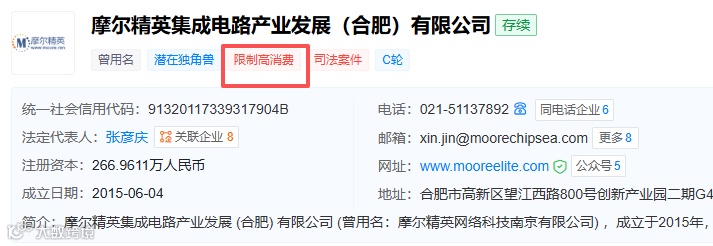 近日,摩尔精英集成电路产业发展(合肥)有限公司及其法定代表人张彦庆被法院出具限制消费令,执行案号为(2025)皖8601执1245号。该公司未在法律文书指定期限内履行义务,已被纳入限制高消费名单。