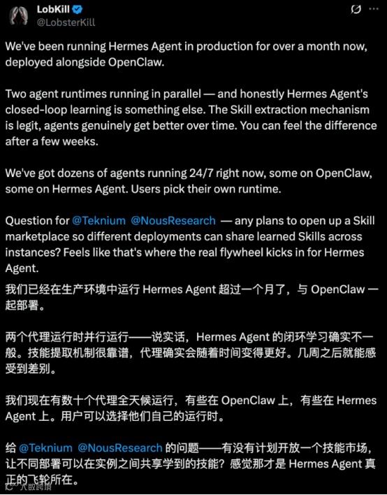 尽管具备强大个体学习能力,Hermes Agent目前尚未建立类似OpenClaw的开放技能交易与共享生态。业内观点指出,若未来补足该环节,支持“私人订制+共享共创”,其生态潜力将大幅跃升。