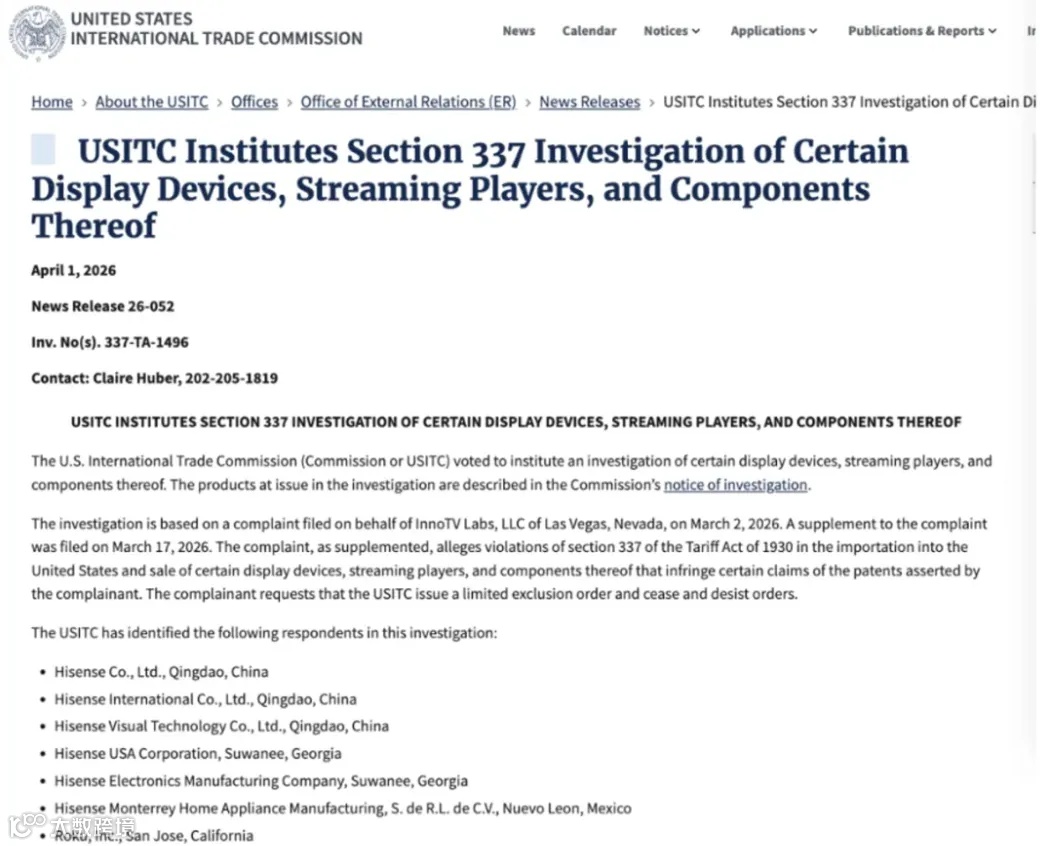 美国国际贸易委员会(USITC)于3月30日至4月1日两天内,对TCL和海信发起两起337调查(案号337-TA-1495、337-TA-1496),涉及智能电视、显示器及相关核心组件,指控其侵犯InterDigital持有的6项视频技术专利。