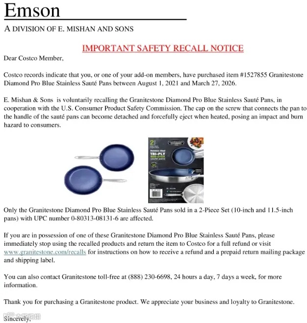 CPSC建议消费者立即停用该产品,并联系制造商E Mishan公司办理退款。Costco同步发布安全召回通知,支持全额退款。
