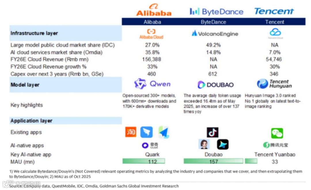 阿里与字节长期被视为国内AI双雄。高盛报告显示,阿里在企业端AI云服务市占率达35.8%,显著领先字节(14.8%)和腾讯(7%)。其布局覆盖全链条:开源Qwen模型生态、阿里云百炼B端平台、夸克/千问C端应用及"夸克AI眼镜"硬件,3天销量破3000台。