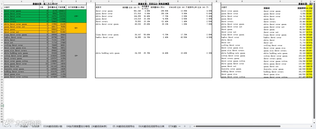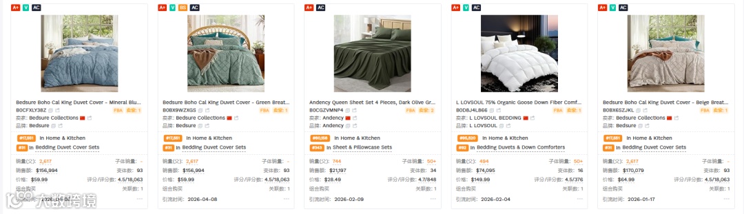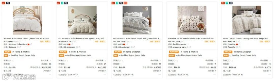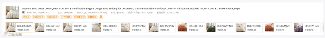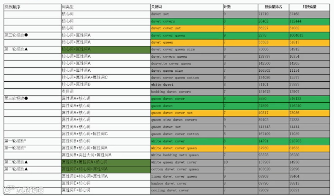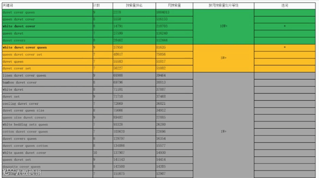 选词策略:选择带有明显属性(颜色+尺寸)、月搜索量在5万-10万级的长尾词(如“white duvet cover queen”)。 -