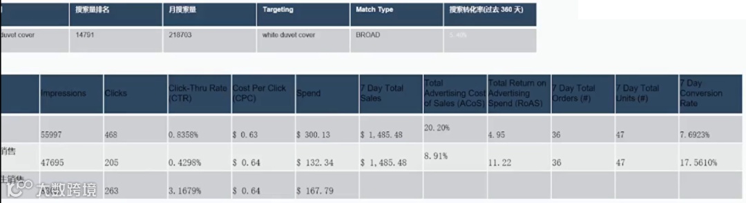 核心大词占位:针对类目核心大词(如“duvet cover queen”),在链接权重稳定后进行精准冲刺。此类词CPC较高(如$1.44),ACOS可能维持在50%以上,其目的是通过高曝光和高转化维持类目排名。