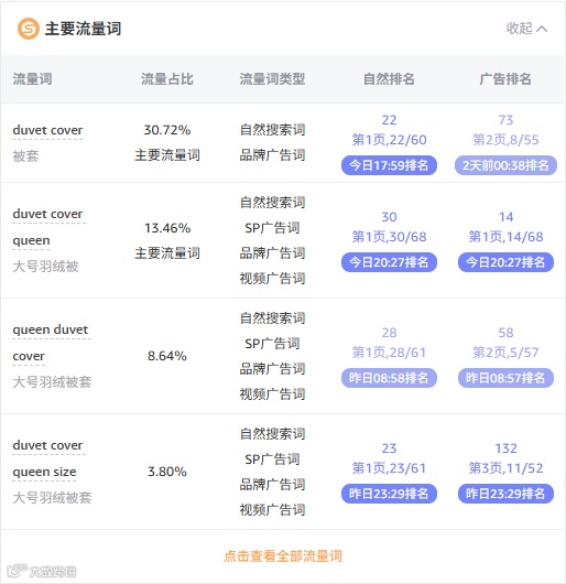 亚马逊官方数据显示,80%的流量来自于搜索结果页。因此,监控竞品ASIN的主要流量词占比是第一要务。