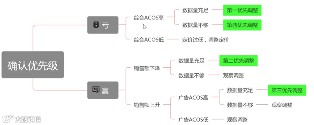 第一优先级:处于亏损状态且综合ACOS(Total ACOS = 总广告费 / 总销售额)远高于毛利率,且数据量充足。这说明广告正在严重拖累整体盈利,必须立即调优。 -