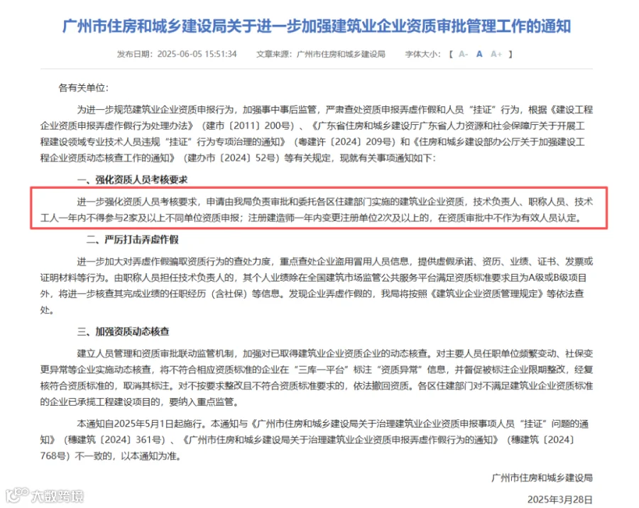 广州、上海、合肥等地的住建部门接连发文:注册建造师、技术负责人、职称人员,一年只能用于1次资质申报,一年内变更注册单位2次及以上,直接不算有效人员!