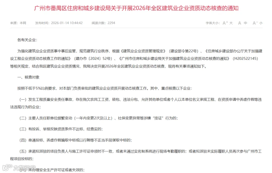 广州:3月24日就发了通知,专门查技术负责人、注册建造师这些关键人员变动大的企业,还有被投诉举报资质不达标的。重点看企业资产、人员、技术装备、办公场所是不是还满足资质标准。