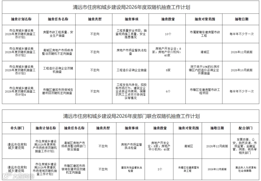 福田区住建局2026年度“双随机、一公开”抽查工作计划、龙岗区跨部门联合随机抽查