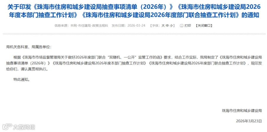 珠海市住建局3月23日印发抽查事项清单及年度抽查工作计划,涵盖以下重点事项: