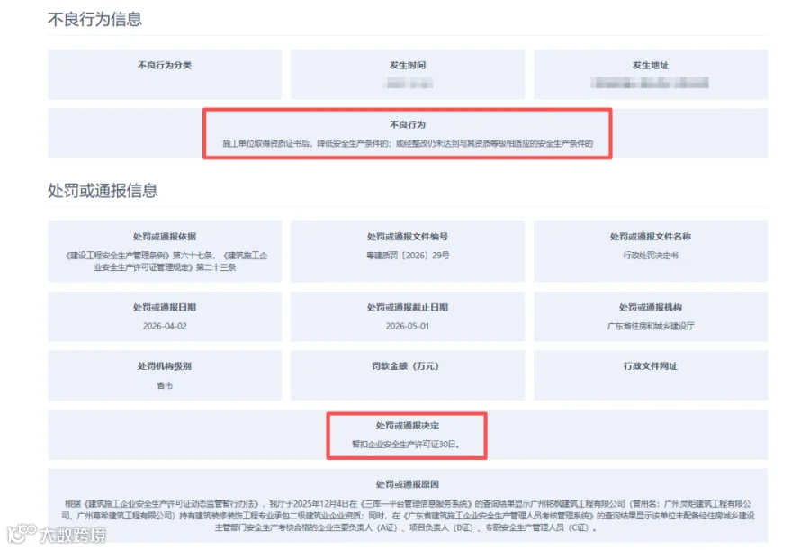 2026年,仅仅过了3个月,广东省住建厅就发布了多批次暂扣安全生产许可证的行政处罚公告,涉及数十家建筑企业,其中不少就是劳务公司。