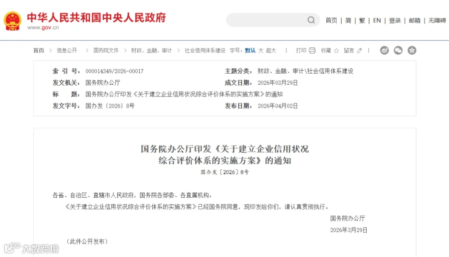 国务院办公厅印发的《关于建立企业信用状况综合评价体系的实施方案》(国办发[2026]8号),明确提出,要对全国企业进行统一的信用评级,评价结果由高至低划分为A、B、C、D四个等级。