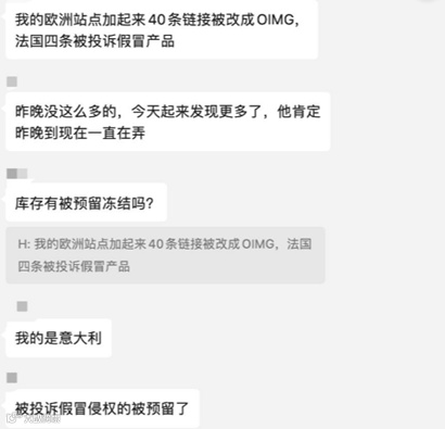 没错,最近又有卖家的listing被人篡改了。这位欧洲卖家多国站点的40条listing均被修改,被填入“OIMG”的商标,而OIMG已经在欧盟注册了商标,于是卖家的listing被篡改之后,直接被投诉为商标滥用,导致法国站的四条链接被投诉为假冒商品,被投诉的链接都被预留处理。