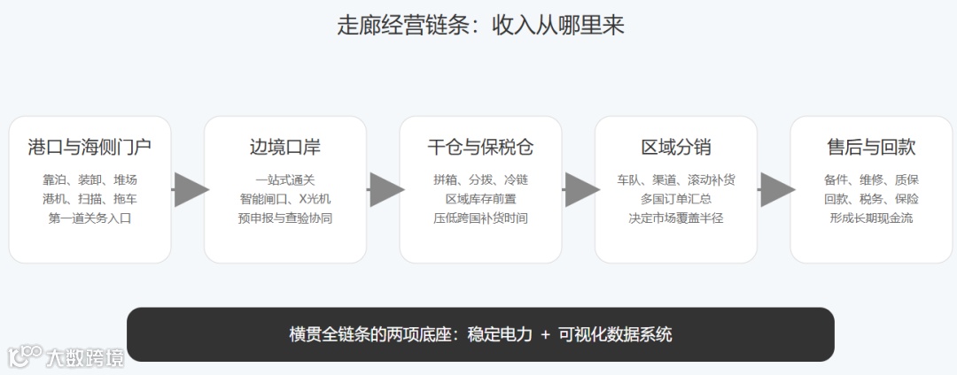 智能闸口、X光货检系统、车队追踪及仓储软件等数字基础设施,正成为通道升级标配。中国企业在低压配电、太阳能储能、安防等领域具备成熟供给能力,可创造持续运维收益。