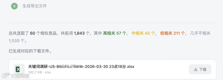 输入1个ASIN,30秒完成全流程:反推核心流量词→拓展相似竞品→去重确认→自动分级→输出含相关性、搜索量、转化率、建议竞价的Excel表格,支持一键下载。