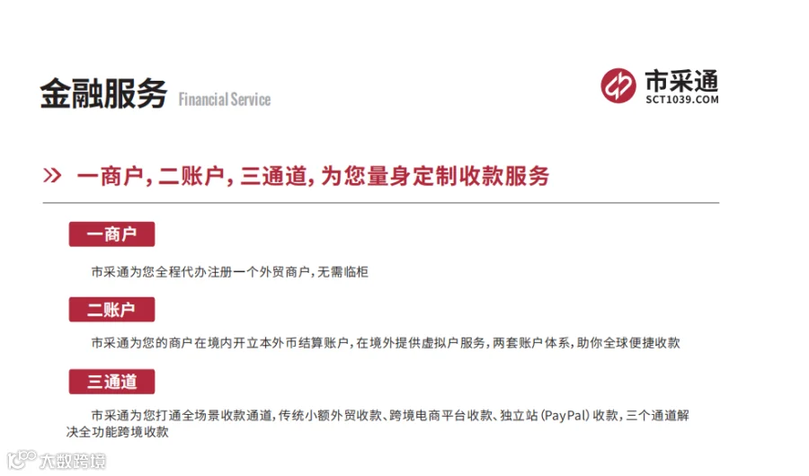 市采通提供"一商户、二账户、三通道"定制化收款服务,专为外贸企业设计。