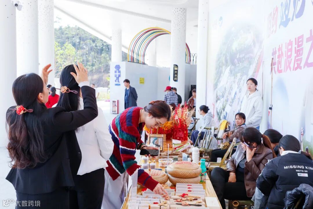 现场设有25个特色摊位,吸引了众多旅客驻足选购。产自信宜的木薯制品、爽滑劲道的大成面、工艺精湛的榄雕作品、香气清雅的沉香制品、以及编织精巧的竹编制品等,纷纷亮相。