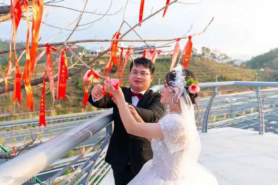 新人们悬挂的爱情锁与许愿带将甜蜜印记永久留存,让交通空间承载起温馨浪漫的情感寓意。