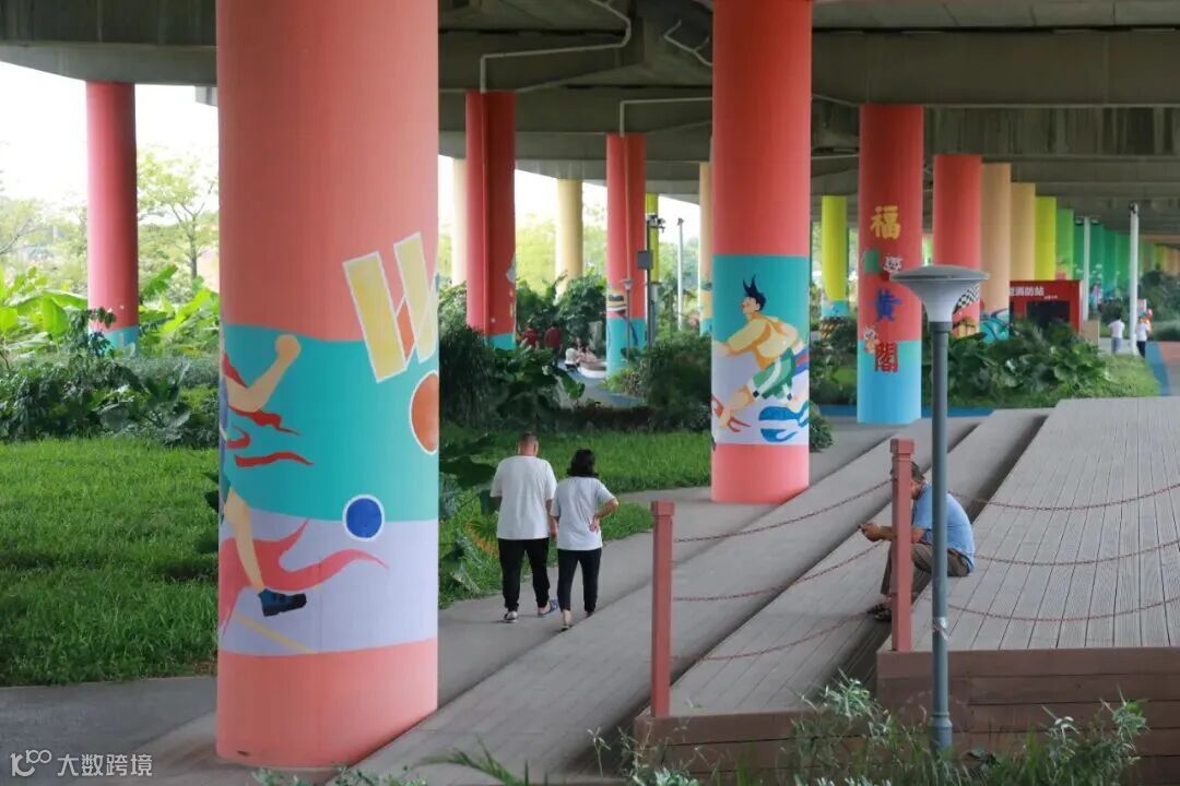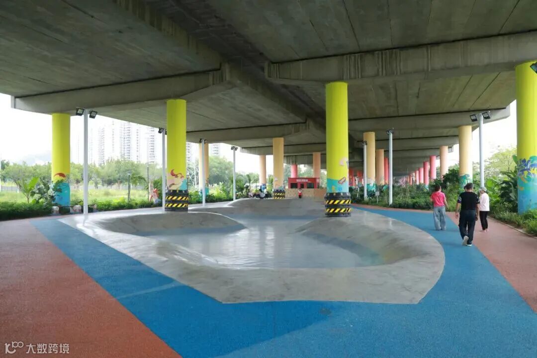 改造后的桥下空间,已发展成为一个功能复合、全龄友好的健身休闲场所。运动区内,设置了足球场、篮球场、乒乓球场及轮滑区等,深受年轻人喜爱;慢行碧道两侧植被丰茂,成为居民散步休闲的天然氧吧。此外,还对桥墩进行艺术喷绘,将其变身为艺术展廊,并配置完善的照明系统、休憩座椅,满足周边近8万多居民日常休闲需要。
