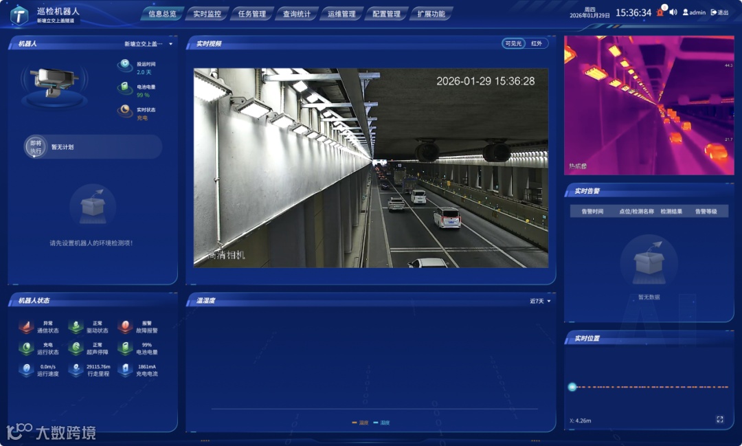 这场高效处置的背后,是广深高速智能巡检机器人的核心驱动。它如同隧道内的“移动鹰眼”,不仅能“看见”,更能“看懂”和“判断”。机器人沿轨道以0.5-0.8米/秒的速度巡航,搭载4K高清摄像头与红外热成像仪,测温范围覆盖-20℃至500℃,可实现7×24小时不间断、无死角精准监控。无论是车辆异常、交通事故,还是温度异常、突发火情、设备故障等隐患,它均能在3秒内识别并锁定,准确率超过98%,并实时将高清画面与数据回传至监控中心,同步联动隧道警示系统启动应急响应,提前介入。