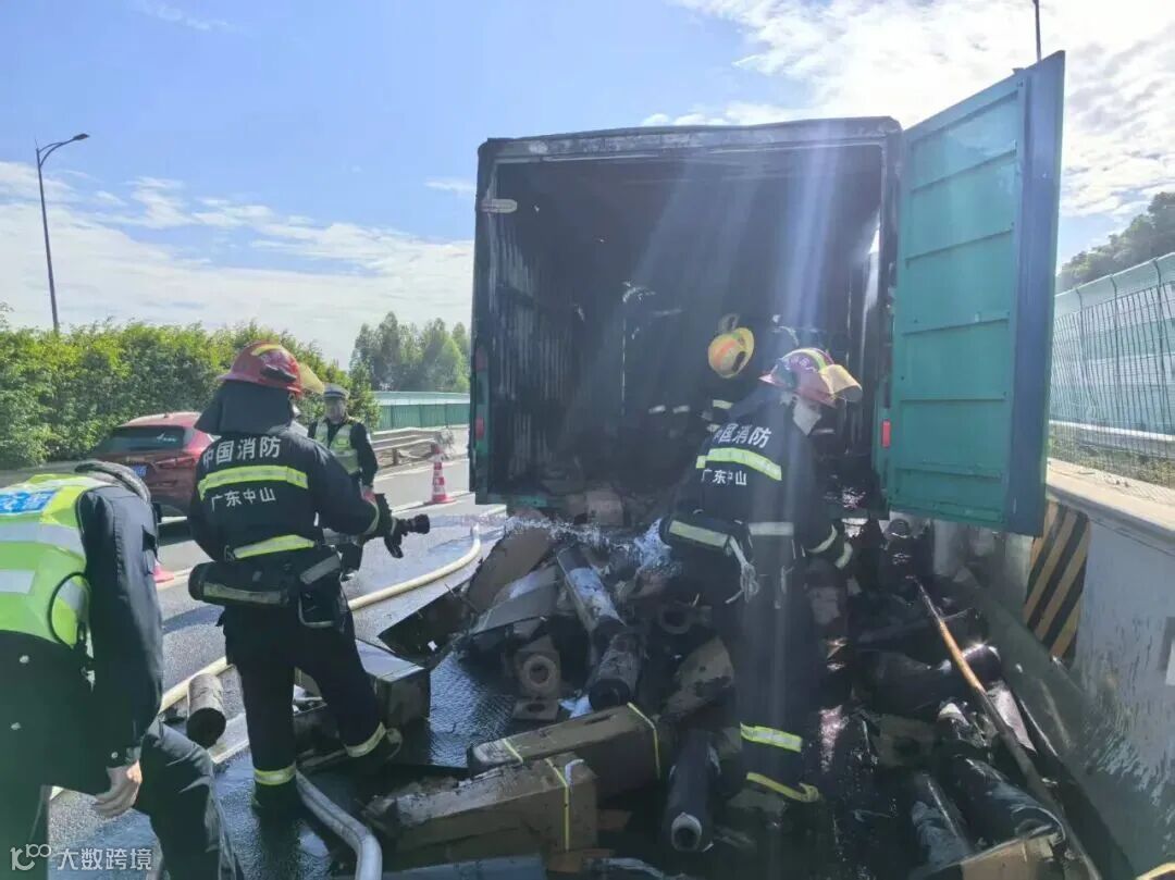 13时56分,消防人员赶到现场,使用高压水流对准着火处及车辆货物持续喷淋,明火被彻底扑灭。14时07分,道路恢复通行。