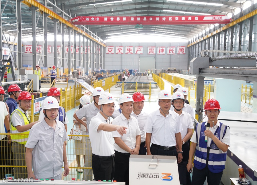 张振飚一行实地察看了狮子洋通道预制梁智能化生产线,认真听取了项目建设进度、“四新”技术应用,以及对青年技术人才培养、产业工人队伍建设、职工关怀等工会工作的汇报。