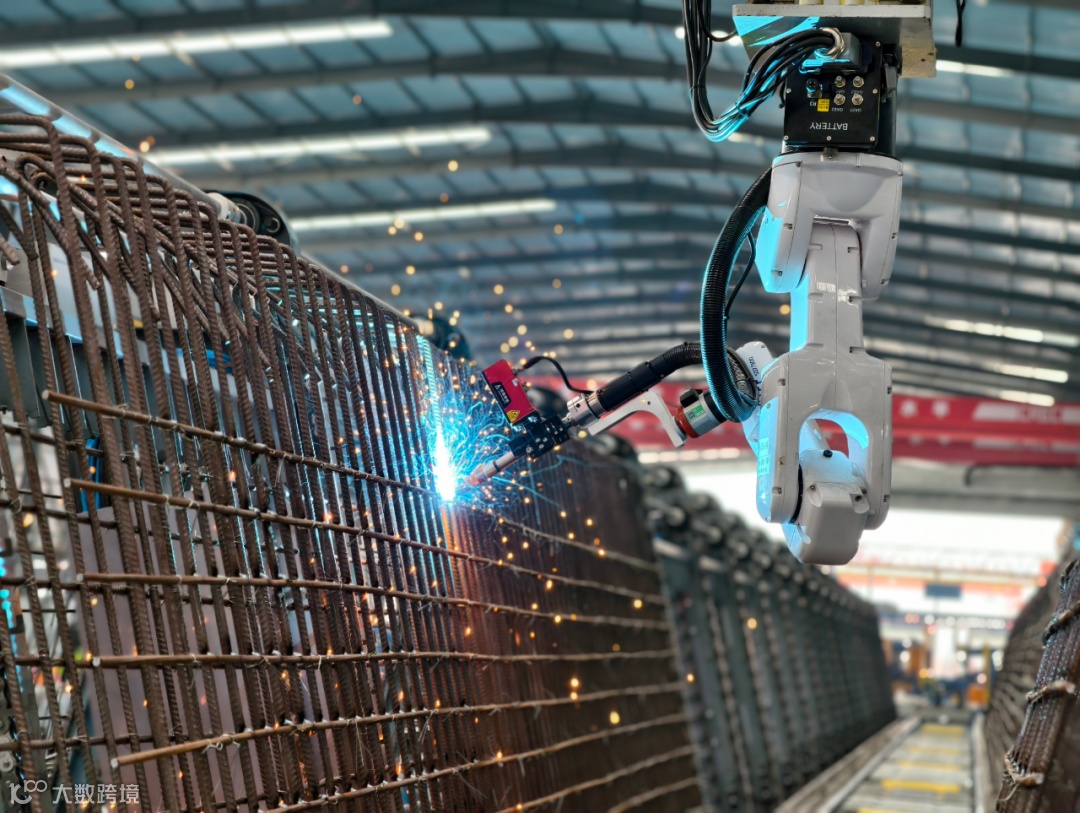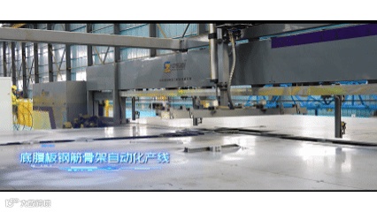 随后,焊接机器人自动识别位置,完成顶板与底腹板钢筋的焊接,钢筋骨架便成型了。
