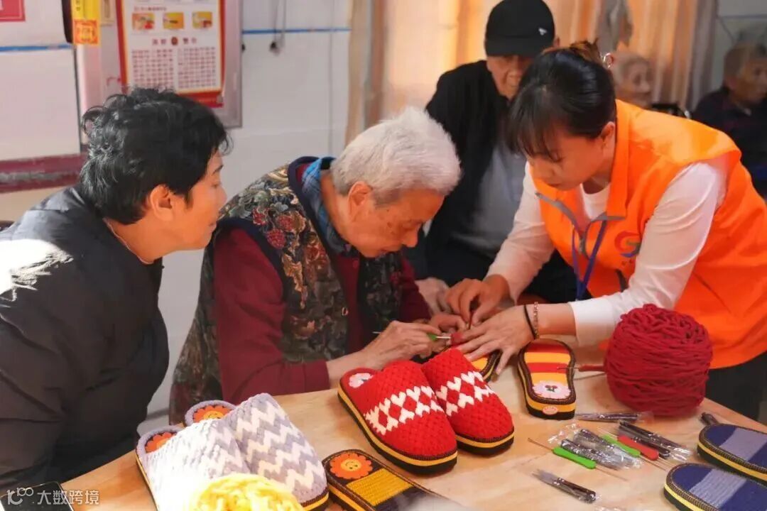 志愿者与长者们围坐在一起,你一言我一语,活动室里满是温馨的笑语。有的长者虽然动作缓慢,但在志愿者的陪伴下完成了一小块编织,兴奋地向身边人展示:“你们看,这是我织的!”志愿者纷纷点赞:“奶奶您太厉害了,第一次学就这么棒!”不知不觉近一个小时过去,在志愿者的协助下,一双双配色柔和、针脚密实、大小合宜的毛线鞋相继完工。