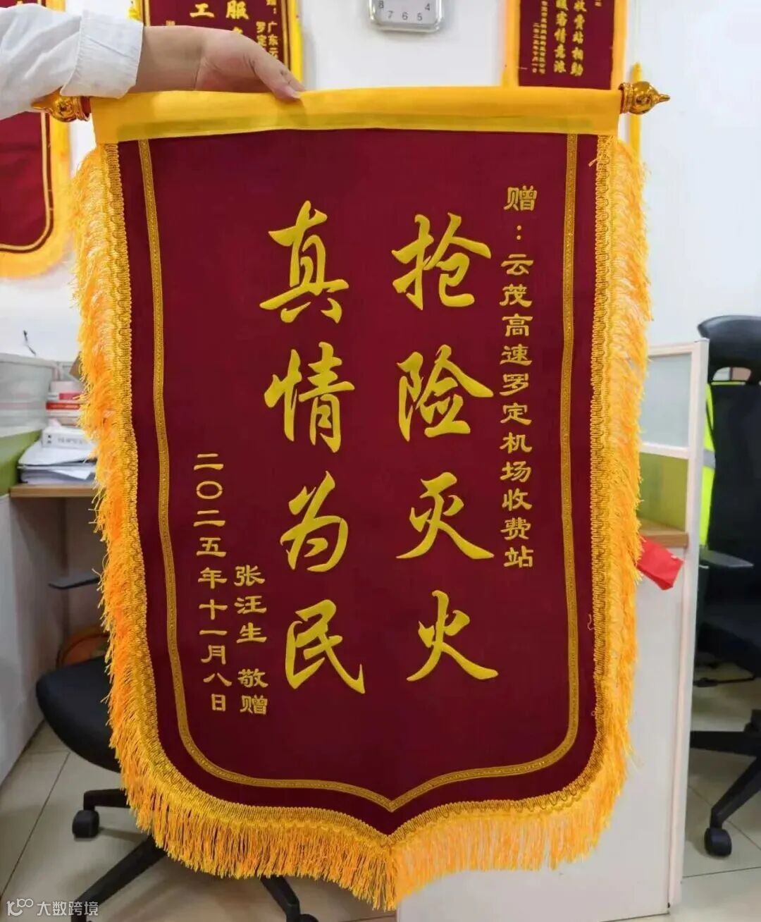 “感谢你们帮忙抢险灭火!”11月10日,云茂高速罗定机场收费站工作人员收到了司机张先生发来的感谢语音,以及一面致谢锦旗。
