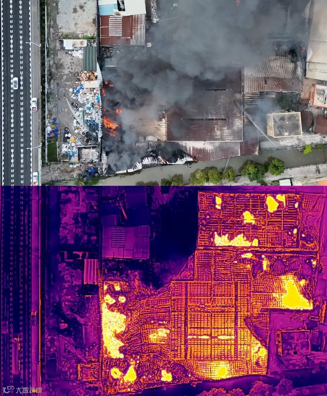 此外,依托高精度热成像镜头,无人机在浓烟、夜间、雾霾等低能见度环境下可清晰捕捉温度异常,准确定位火源。今年6月11日,广珠西线高速南行K47路段桥梁外30米处一废品收购站发生火灾,路政员利用无人机热成像功能准确获取火灾现场温度分布图,精准标注出火源核心区与蔓延方向,为消防部门锁定火源、快速灭火提供有力支持,并成功保护了桥梁结构物免受高温侵蚀。