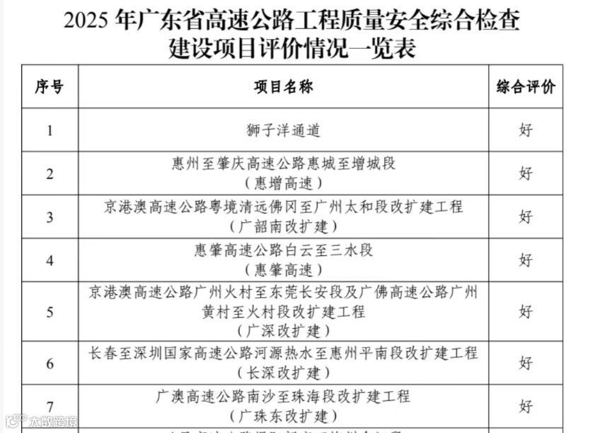 12月,狮子洋通道项目、广深高速改扩建项目、广珠段改扩建项目在2025年全省高速公路工程质量安全综合检查中,被综合评价为“好”。