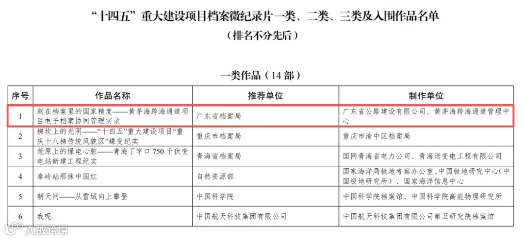 黄茅海跨海通道项目《刻在档案里的国家精度》获评“十四五”重大建设项目档案微纪录片一类作品