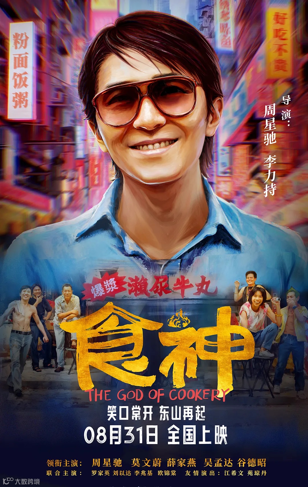 在一同发布的定档海报中,食神史蒂芬周(周星驰 饰)极具“漫画感”的巨幅画像让人眼前一亮,与“爆浆撒尿牛肉丸”店面伙伴们其乐融融的画面遥相呼应,饶有要共同称霸小吃街头之感。影片由李力持、周星驰执导,周星驰、莫文蔚领衔主演,吴孟达、谷德昭、刘以达、薛家燕、李兆基、江希文、田启文、欧锦棠、罗家英、钟丽缇、林雪出演,将于8月31日全国上映。