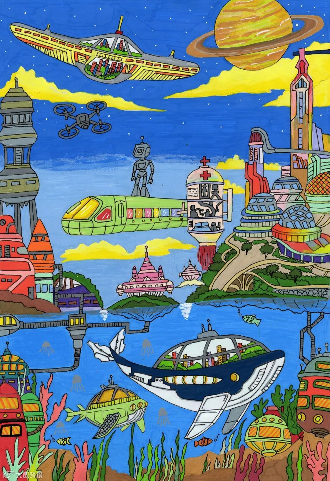 作品以“平面纸张变立体” 为题材,在画纸上构建了一个未来交通场景。