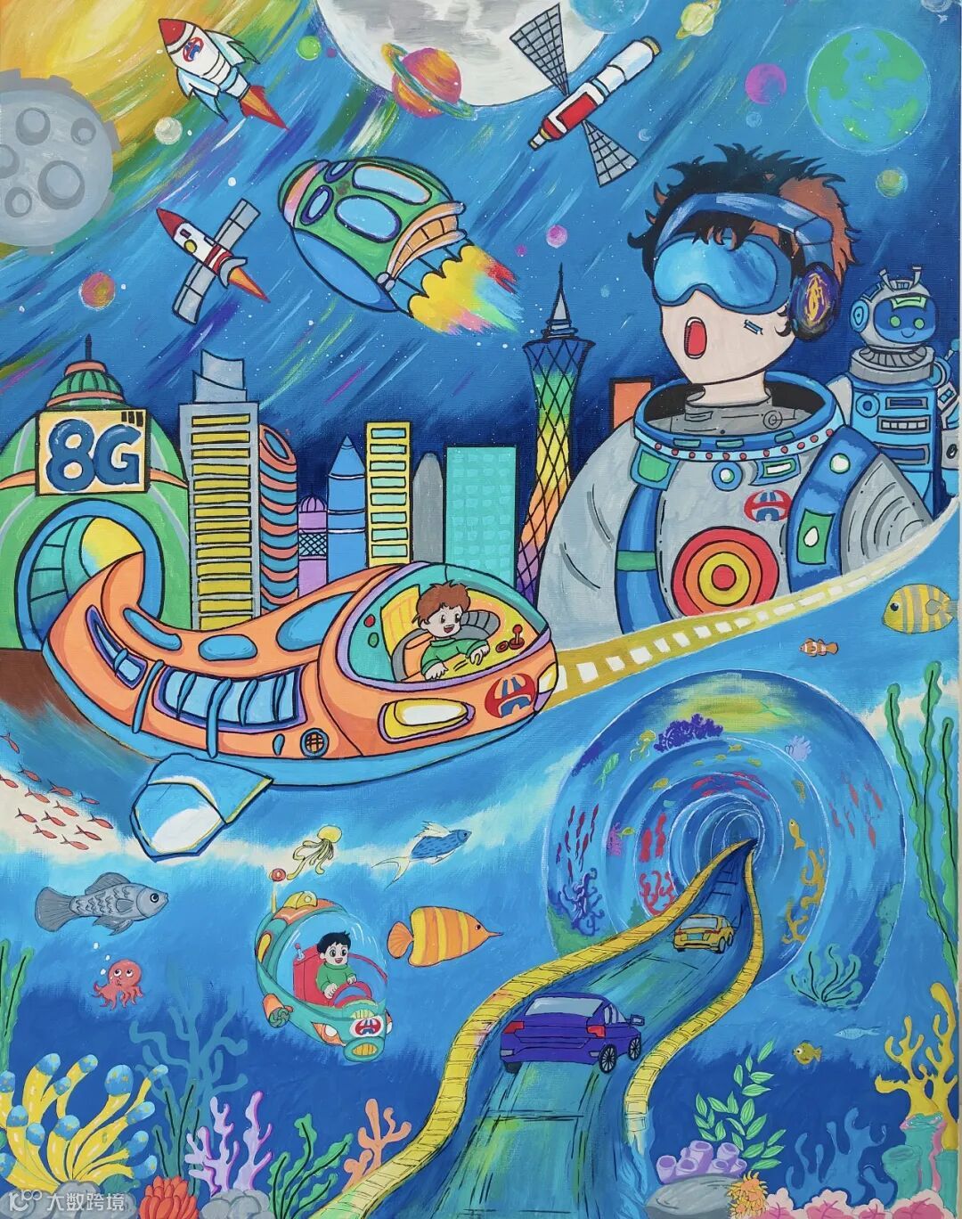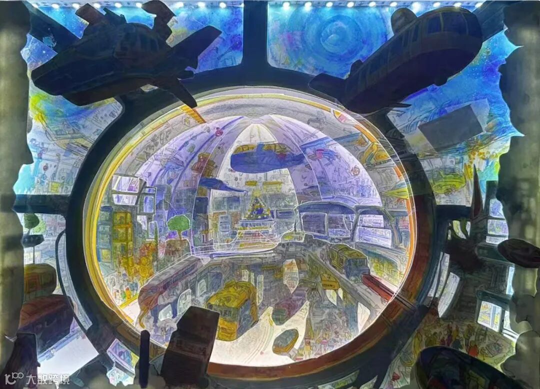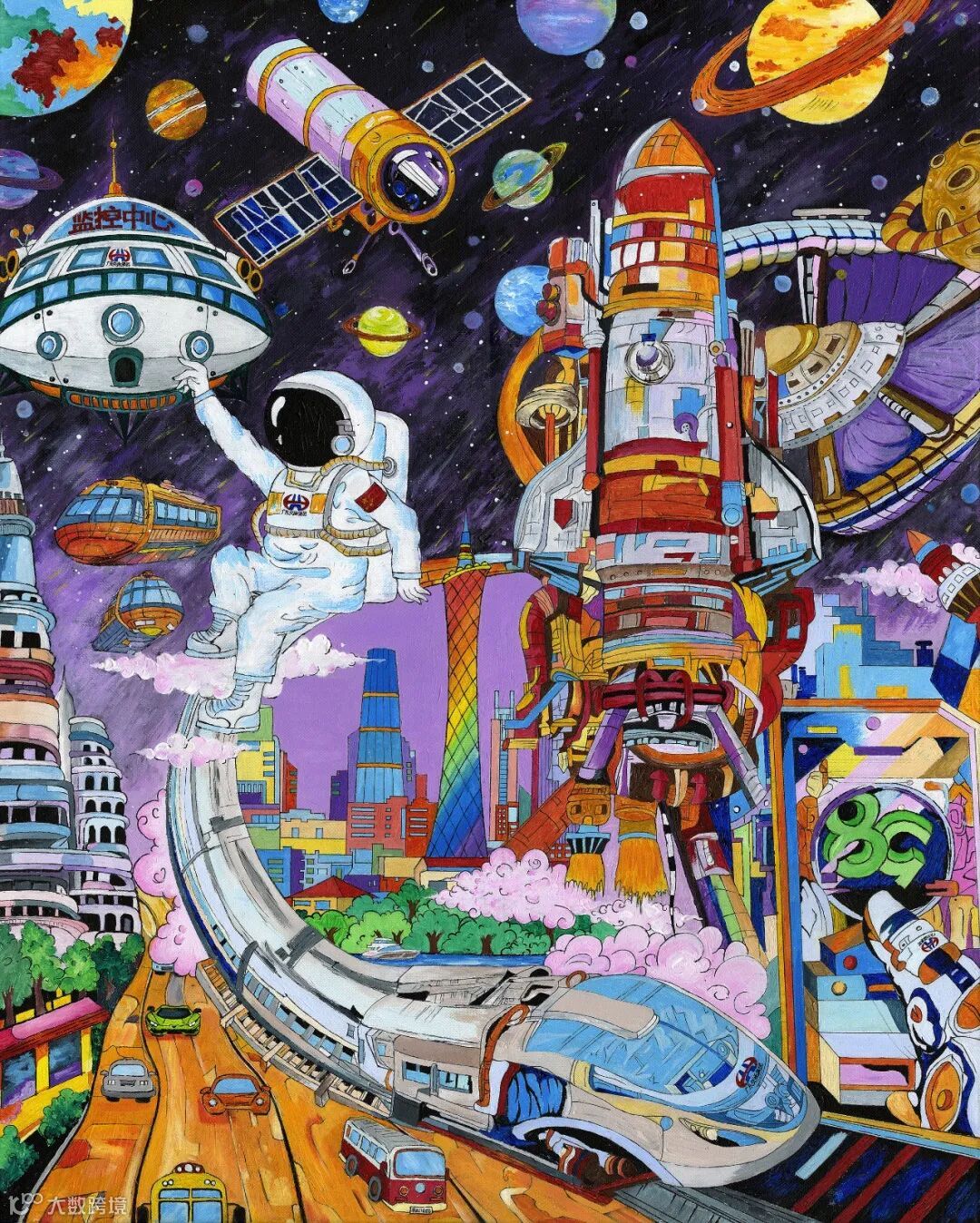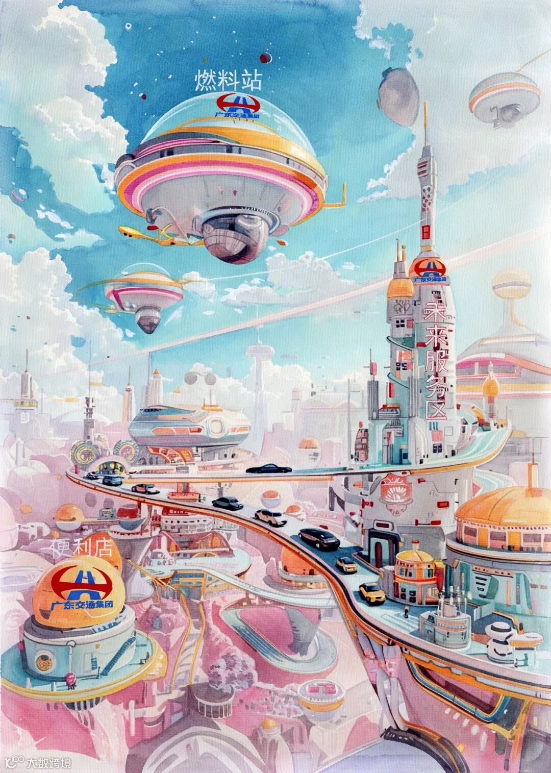 作品以“交通梦 连心河”为主题,描绘了星际与都市的科幻交通场景,表达对集团突破空间、连接万物的赞颂。